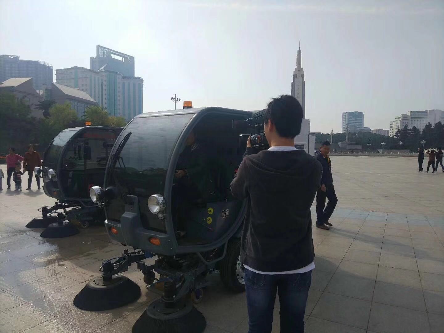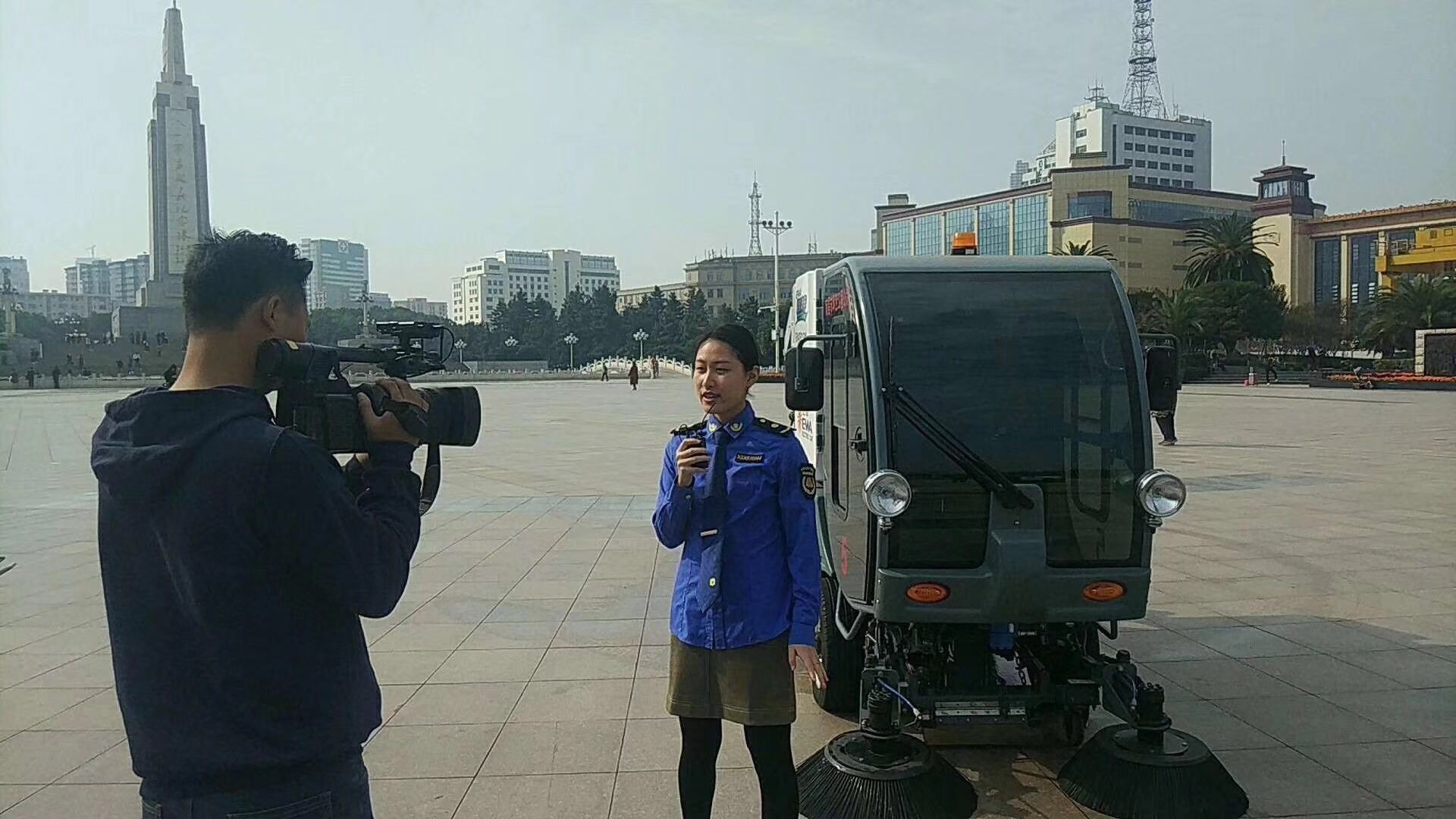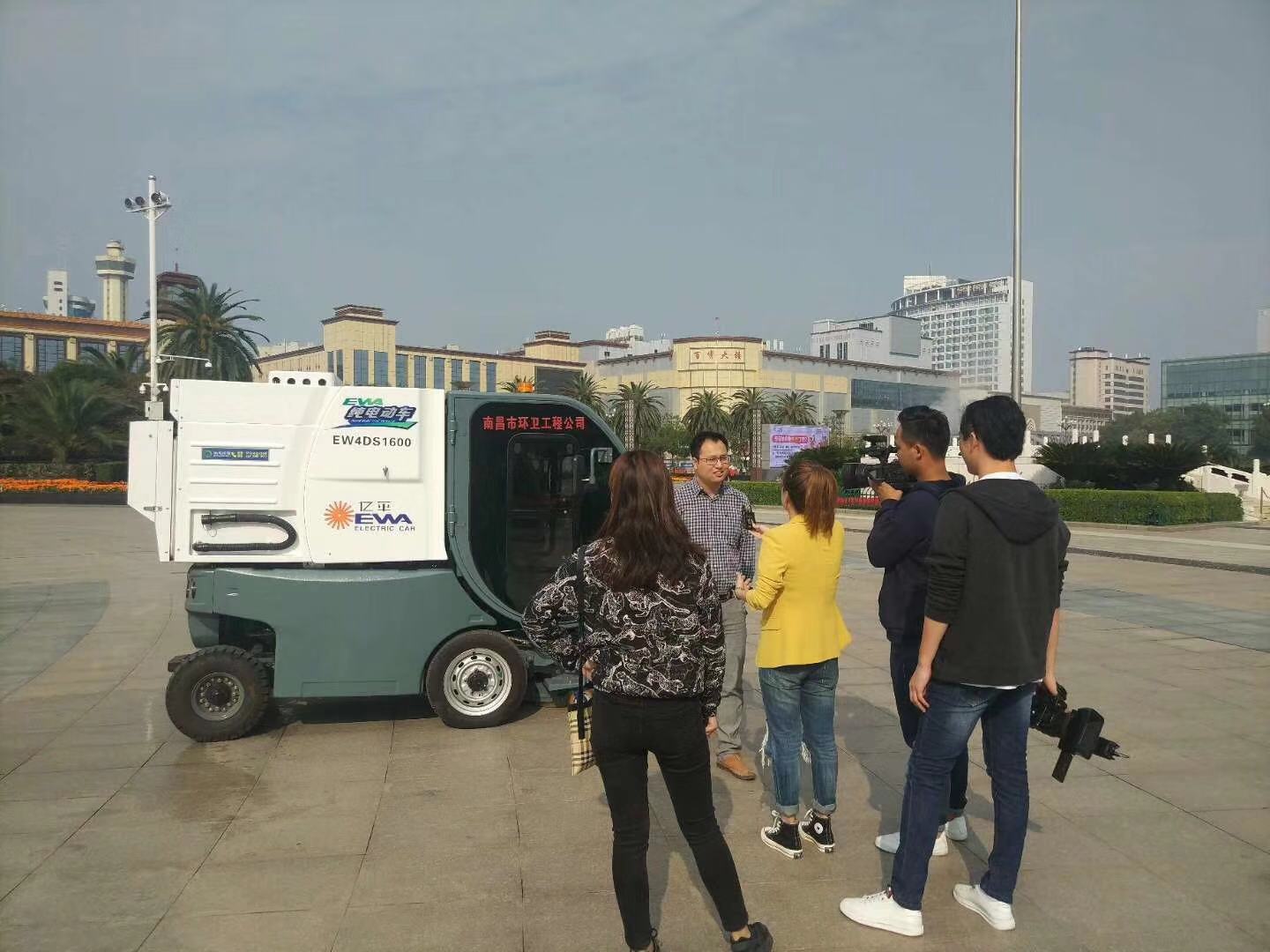 媒體采訪八一廣場上的電動清掃車場景: